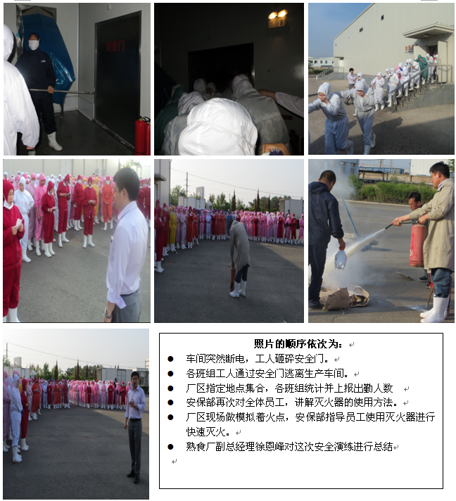 熟食二廠全體員工332人,于2013年06月16日16:40分,在熟食廠副總經理徐恩峰、公司安保部劉龍軍的指揮下,進行了一次以“緊急事故發生時熟悉疏散路線、提高疏散速度、減少人員傷害“為目的的模擬安全演練。